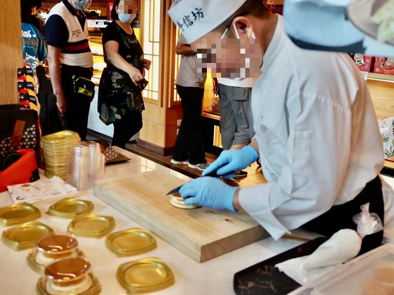 師傅的手沒有停過,一直把現作的銅鑼燒切成4小片分給遊客們試吃