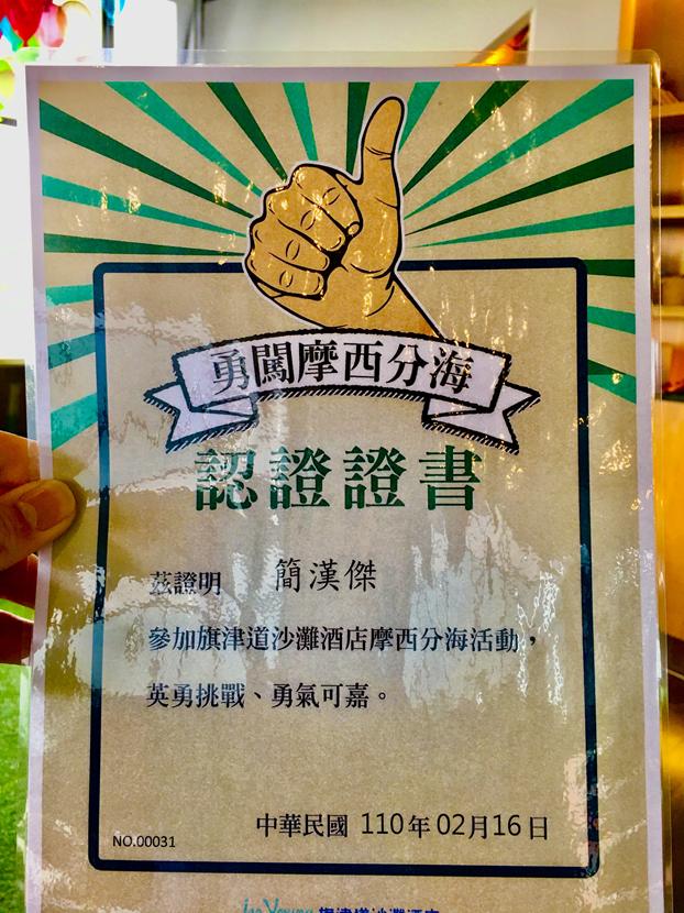 有參加摩西分海的房客隔天退房,飯店會發給你一張”勇闖摩西分海”證書(每房一張)