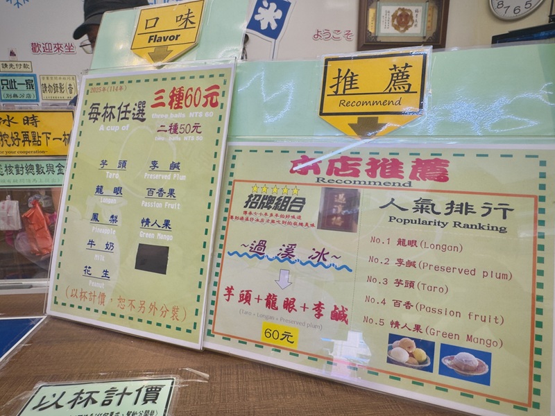 新建利冰店提供八種口味的手工冰品,包括芋頭、龍眼、鳳梨、牛奶、花生、李鹹、百香果和情人果