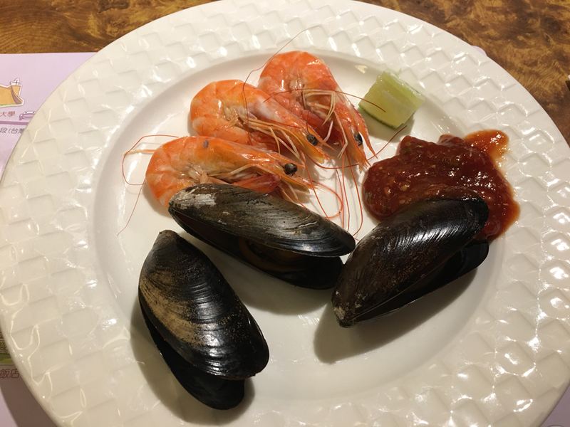白蝦很新鮮,淡菜加了檸檬跟五味醬後超好吃,大推!~ XD