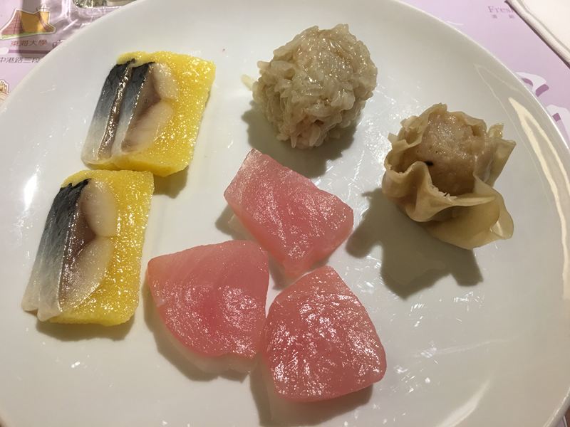 魚卵豆皮壽司、花壽司、臘腸、水果海鮮沙拉←都還不錯吃