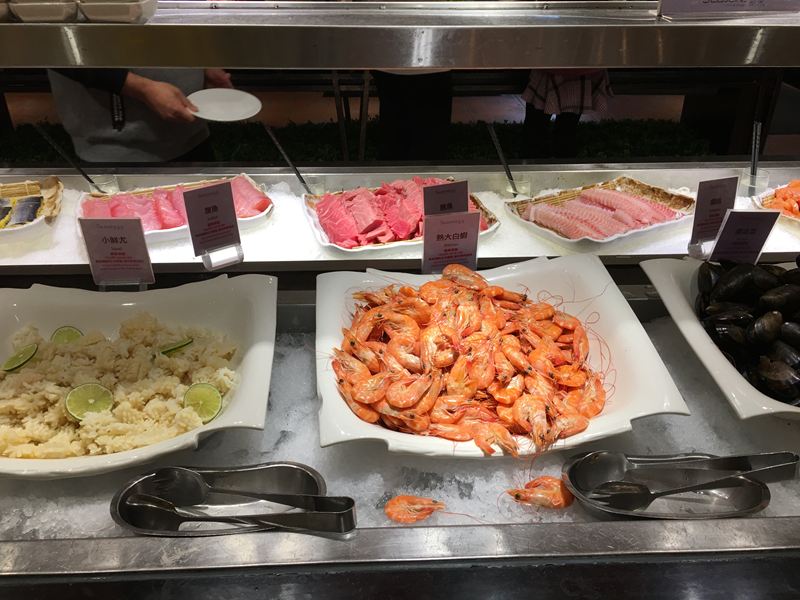 好吃的東西還是非常多,雞腿排、鐵板燒、甜點、生魚片、白蝦等等的餐點