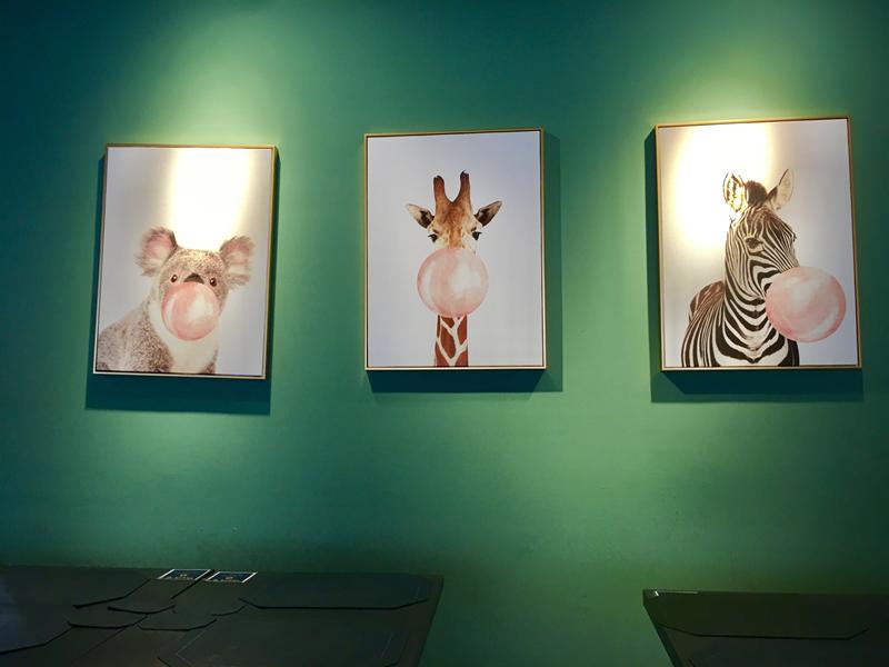 無尾熊、長頸鹿、斑馬吹著泡泡糖的畫面很逗趣可愛