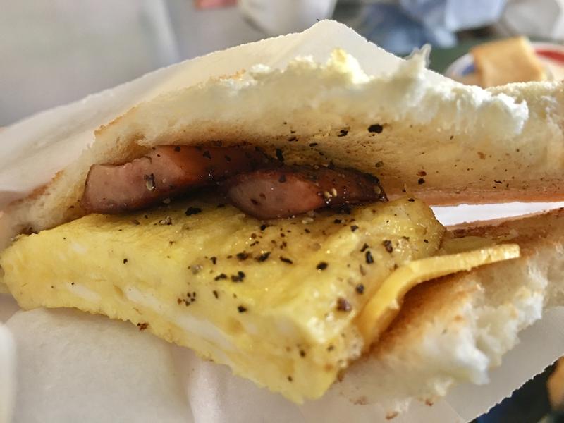 內餡是德式香腸與一個很厚的蛋(幾乎有兩公分厚)撒上一些黑胡椒