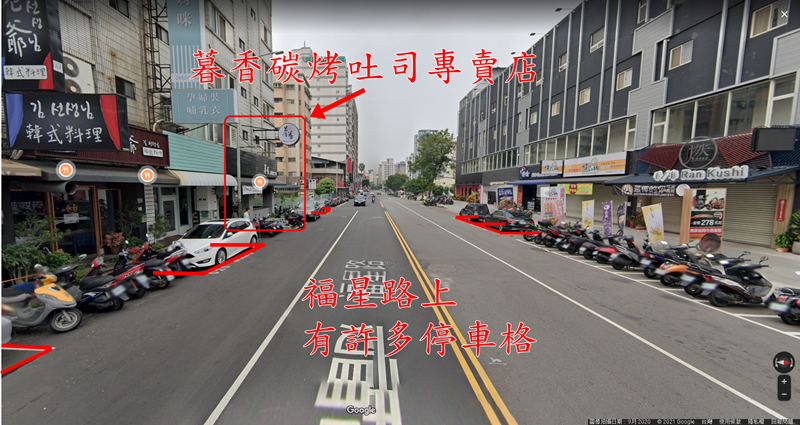 暮香逢甲店位於逢甲商圈周邊的福星路上,店家門口外面有許多停車格