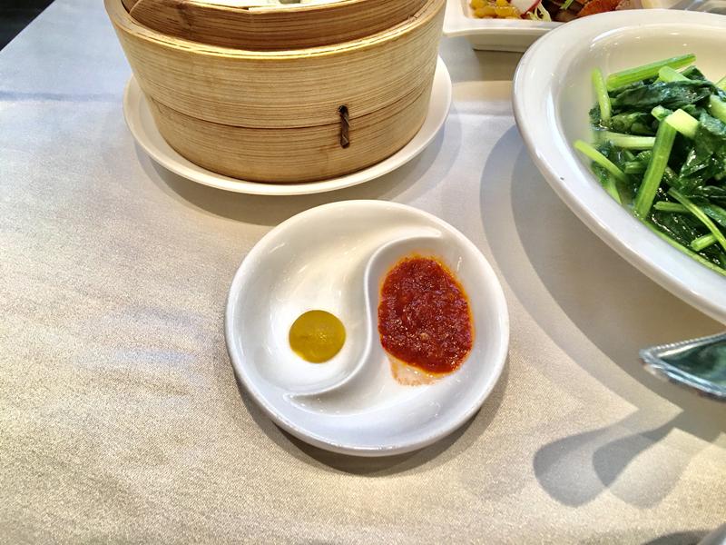 左邊是黃芥末醬,右邊是辣椒醬,搭配餃子沾著吃有不一樣的風味