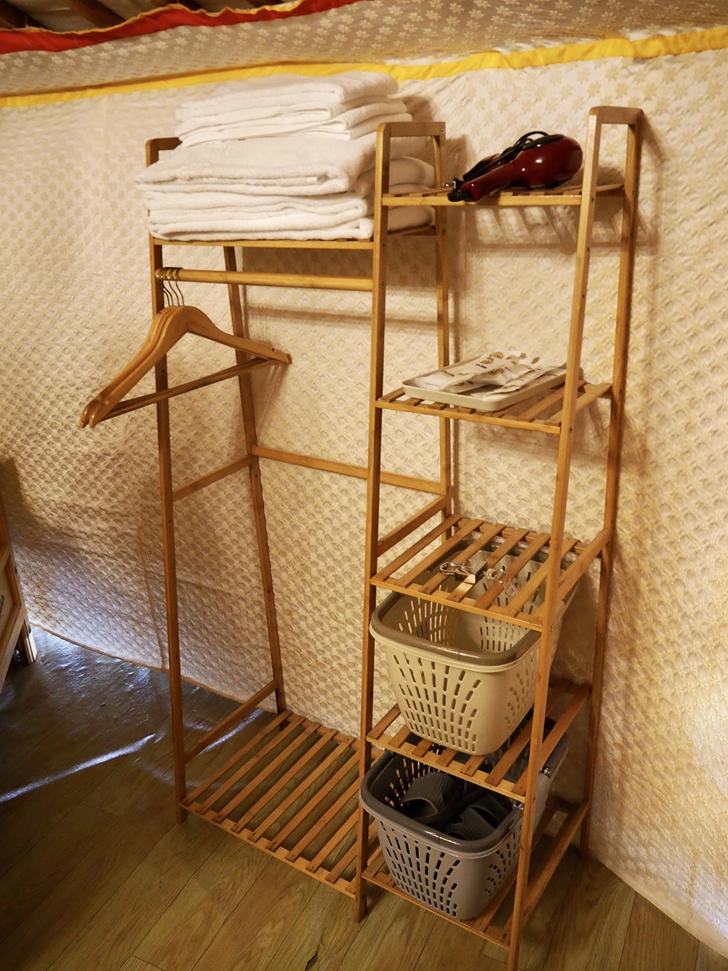 房內有一個衣架,擺放著盥洗用品與吹風機,底下籃子裡有拖鞋可以換,還有一個空的衣籃要去洗澡時可以拿來裝衣物,蒙古包內沒有浴室,洗澡上廁所要到住宿區外的淋浴間與廁所,雖然有些不方便,但距離不會很遠