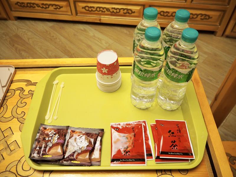 中間的桌子有:面紙、熱水壺、鏡子、礦泉水、茶包等等的入住用品