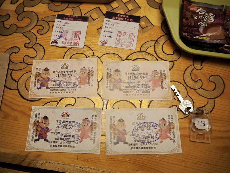 辦理好Check in取得這次入住一泊二食方案的早餐劵與晚餐劵,還有1小時的蒙古服體驗卷,以及蒙古包鑰匙1把
