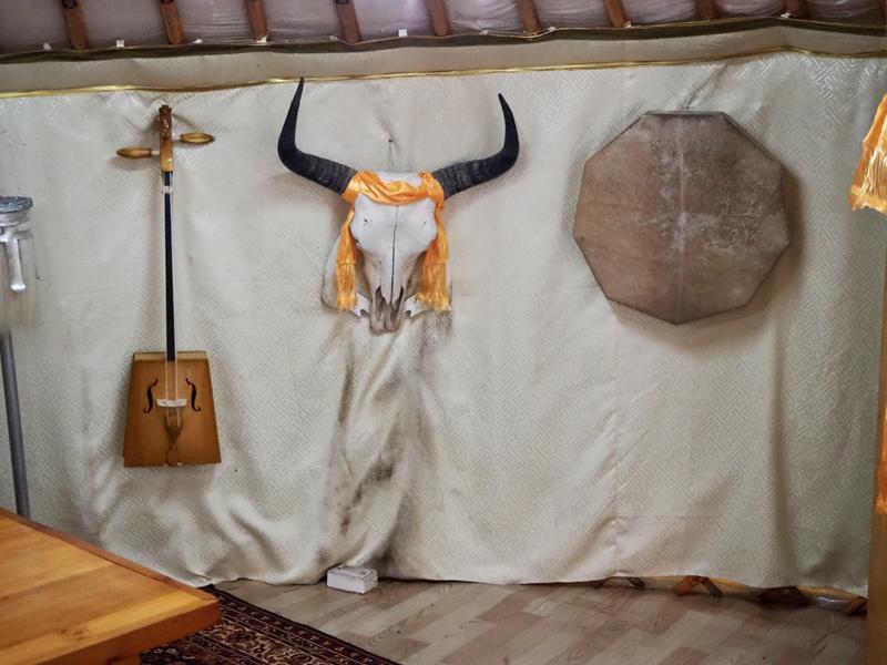 服務人員說這間叫做帝王帳,並不是入住用的蒙古包,裡面有擺放著一些從蒙古那邊運過來的桌椅、櫃子、旗幟、馬鞍、弓箭、馬頭琴與鼓,可以隨意入內參觀