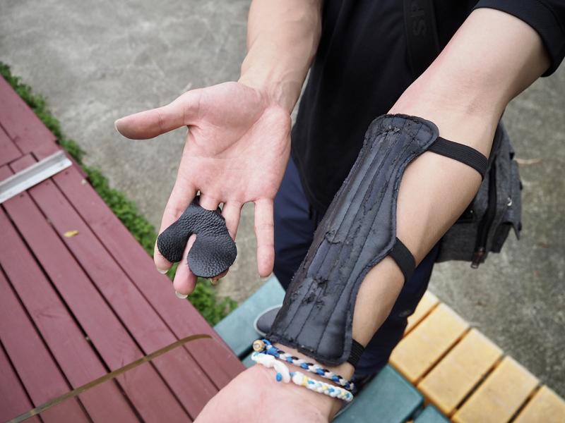 弓也換成了射箭體驗的弓,在體驗射箭之前必須先戴上一些護具防止受傷,戴在左手臂上的護套是防止拉弓時箭弦回彈到手臂,右手的指套是用來拉弓時減少手指磨擦的不適感