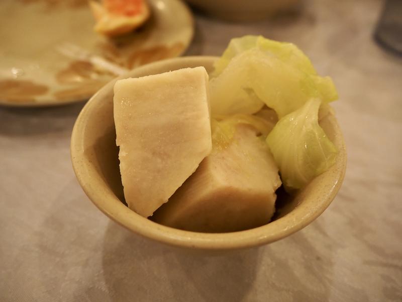 在酸菜白肉鍋中煮的火鍋料也是不添加調味料就有味道,特別是芋頭很鬆軟又有一股特別的清甜酸味,還滿好吃的