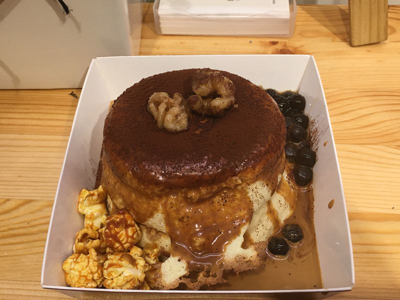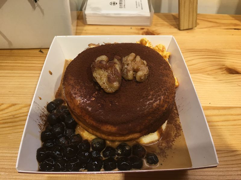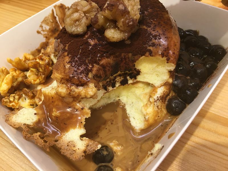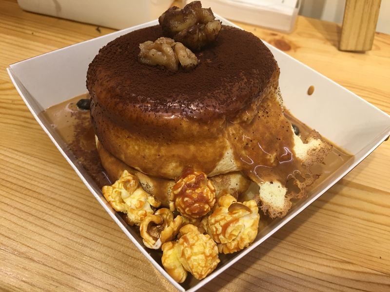 舒芙蕾鬆餅、巧克力醬、可可粉、核桃、爆米花、珍珠