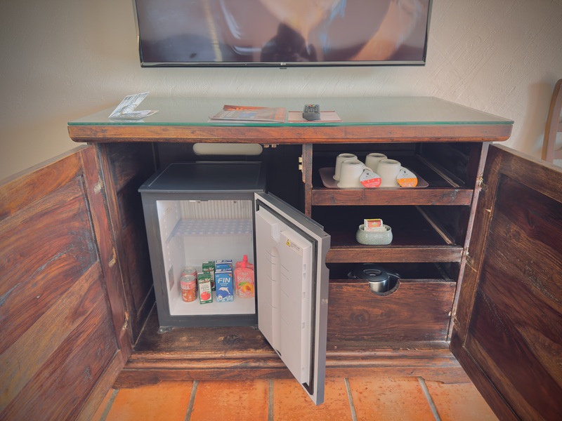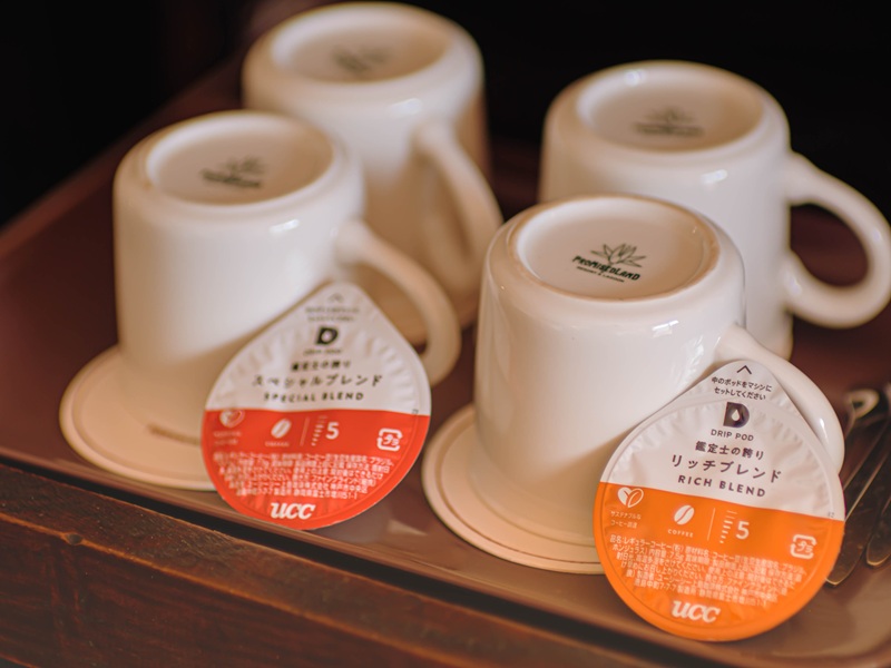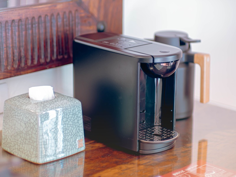 冰箱裡放著為迎接客人準備的飲料,而桌上則擺著一台膠囊咖啡機,隨時可以沖泡一杯香醇的咖啡