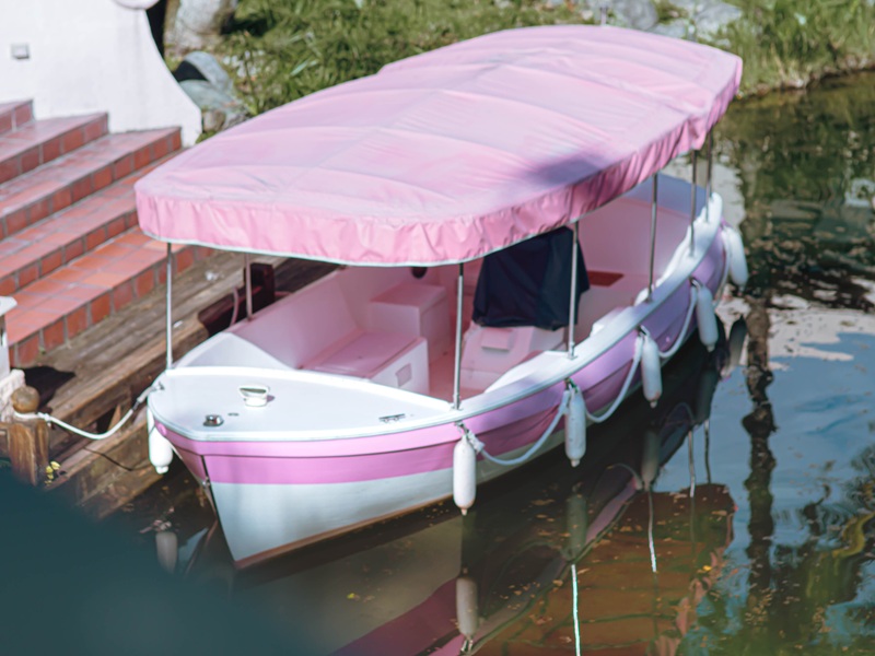 一般搭乘的遊艇都是這種藍白色系,不過另外有推出專為女性朋友或閨密打造的輕旅行住宿專案,不僅有粉紅專屬的電動接駁車接送,還能享受粉紅碼頭和遊艇的獨特體驗