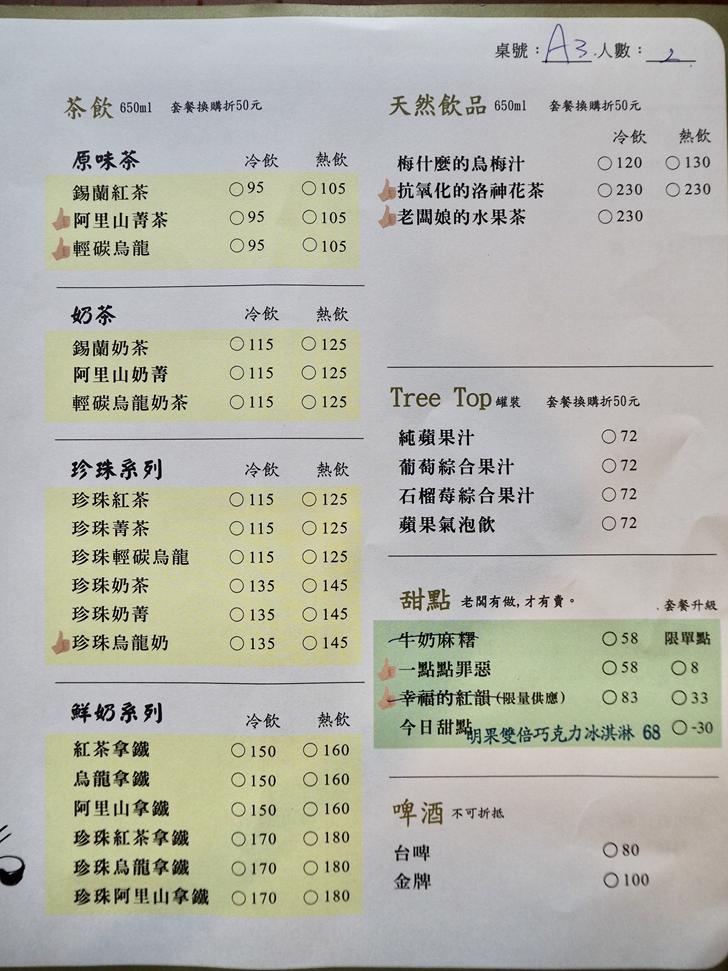 有茶飲、有湯品、有甜點,某些品項有套餐加購價格,也有單點價格