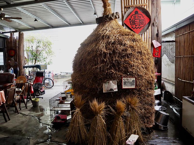 農莊前庭陳列了許多用具:蓑衣、斗笠、竹簍、鋤頭、碾米機等等