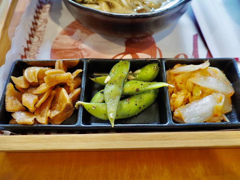 隨餐附的三樣小菜:醃蘿蔔、毛豆、泡菜