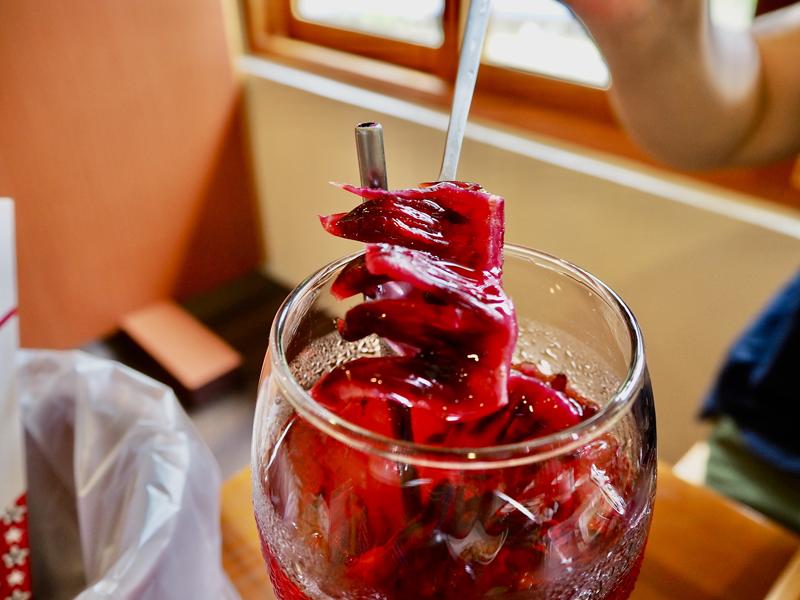 後來一詢問之下才知道,他們的洛神花都是自種自摘,再用冰糖醃漬,跟一般外面乾燥後的洛神花不一樣