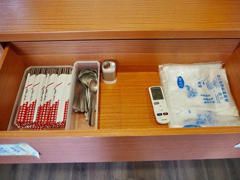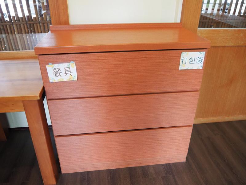 一旁的櫃子裡有餐具與打包袋,食物吃不完可以打包帶走