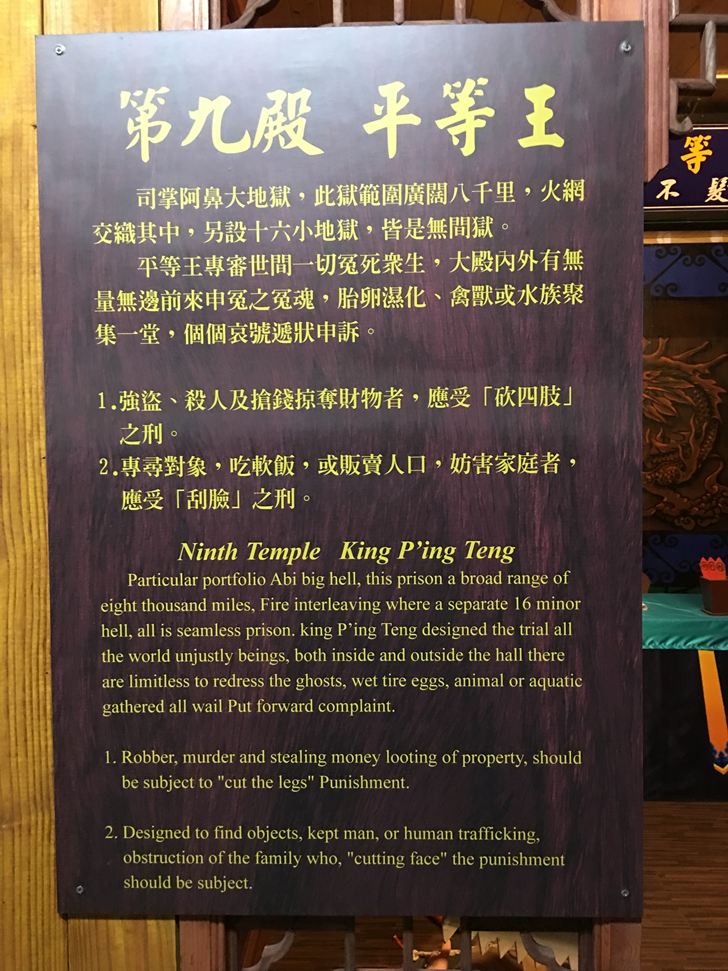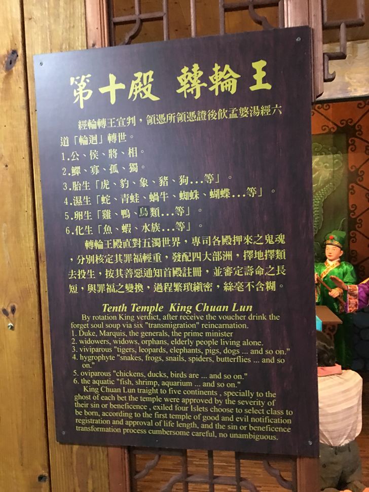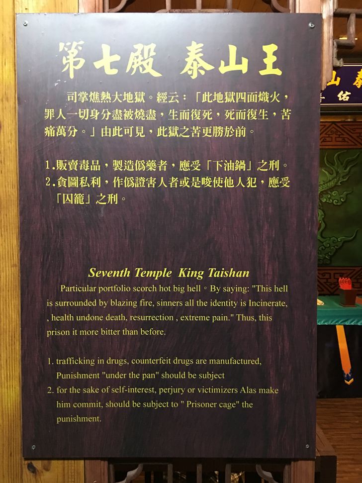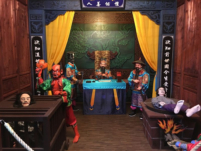 閻王在審判的佈景,門上還有每個十八層地獄刑罰的介紹