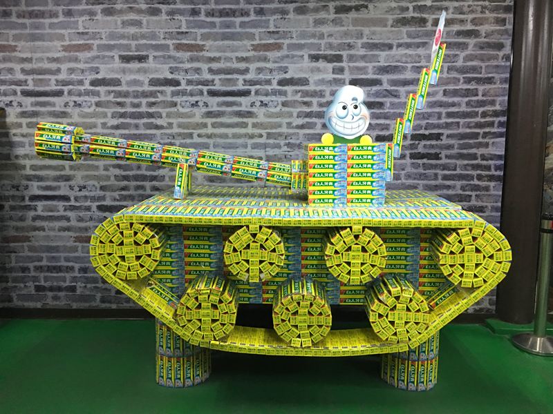 兵馬俑的旁邊有一個用白人牙膏排出來的牙膏戰車,