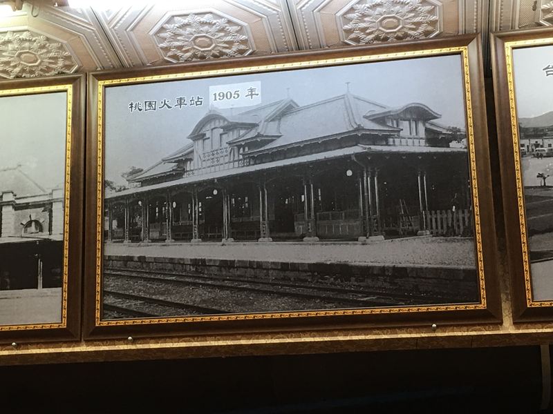 牆上有著舊時代各縣市車站的照片