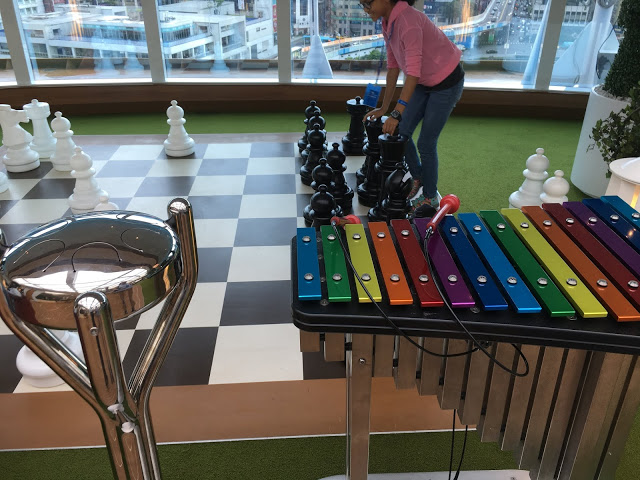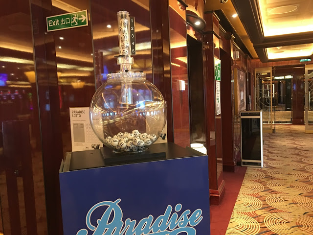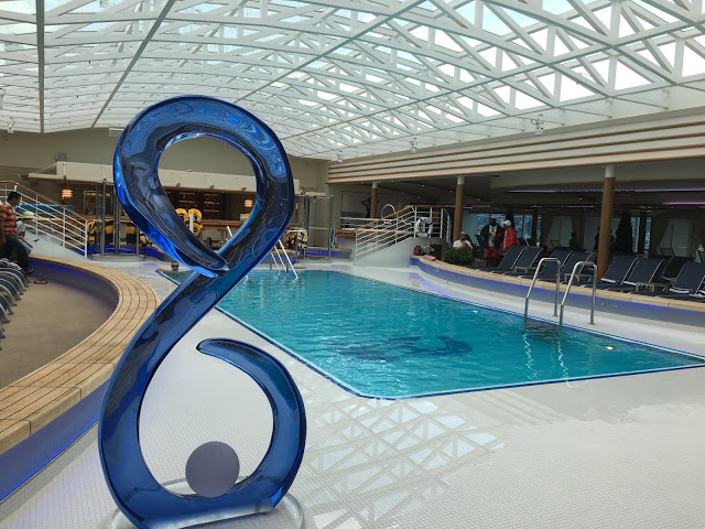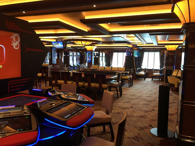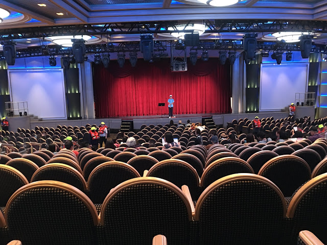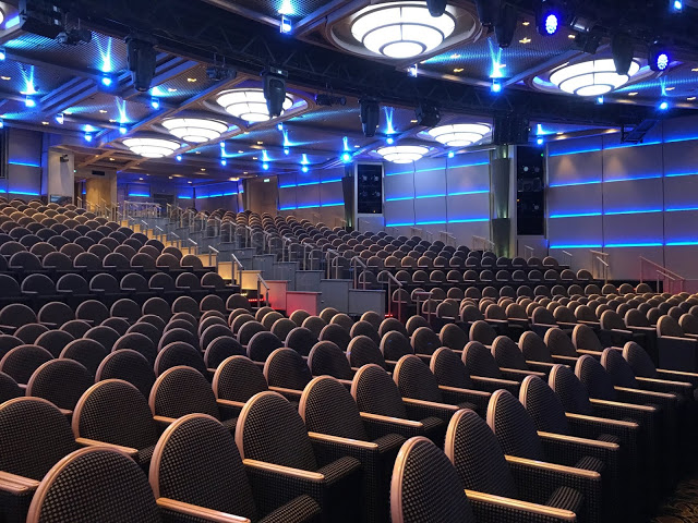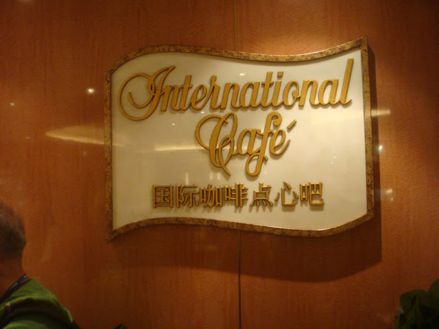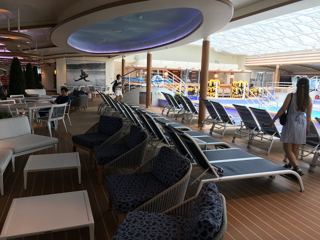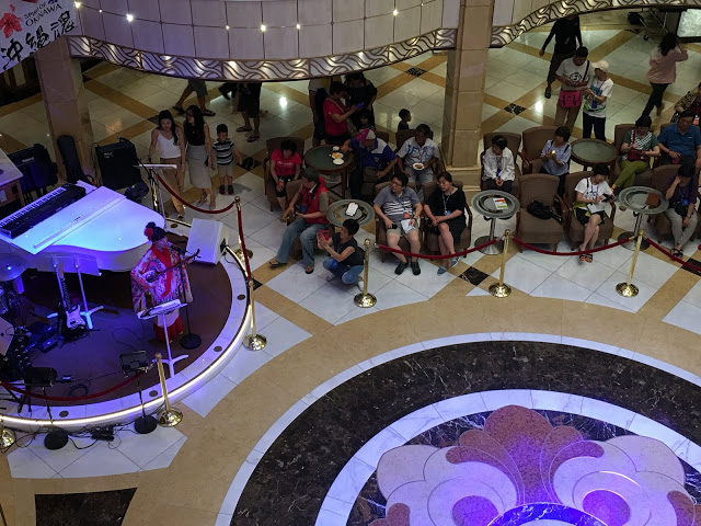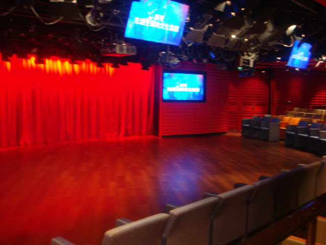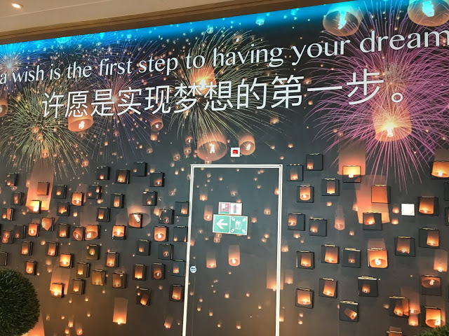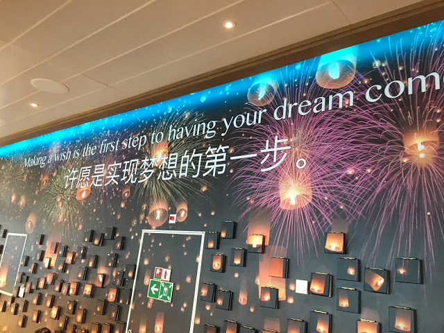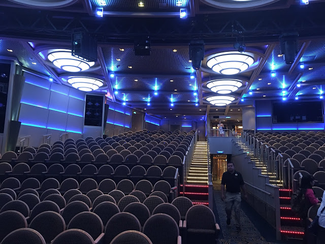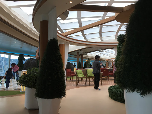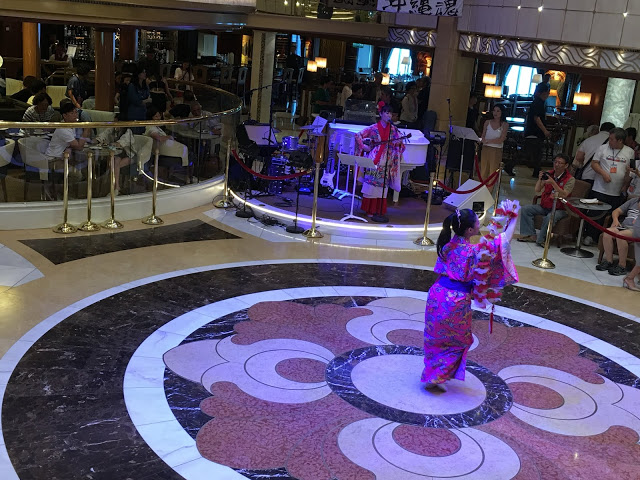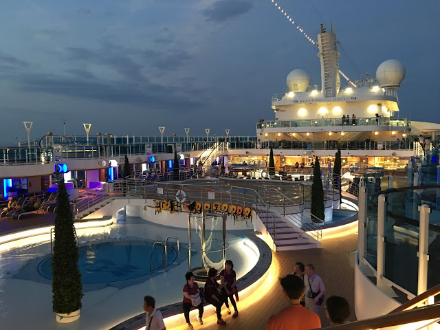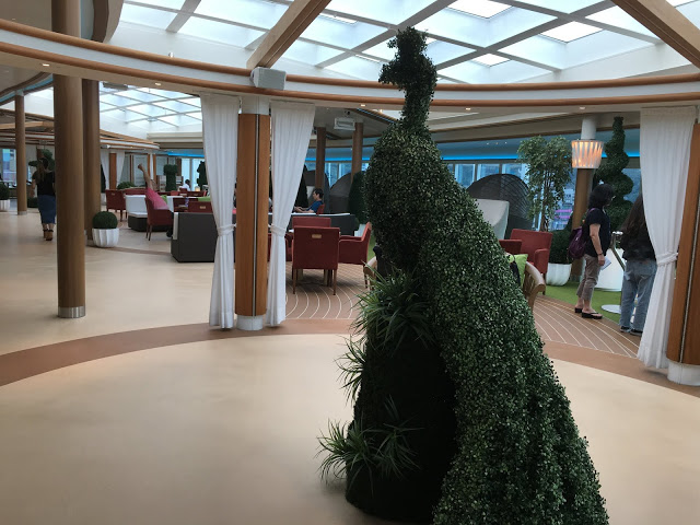 這裡也是航行中活動最多的地方 船長之夜,氣球派對,各式表演活動等 這五天幾乎都在這裡舉行也是最常會來到的地方 ,經過登船排隊之後也來到將近1點多,該是祭五臟廟的時候了當天主題餐廳中午沒開放,我們排到第二梯次19:45分吃晚餐,所以就先到有開放的16樓環球美食自助餐廳吃東西