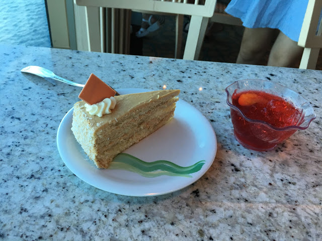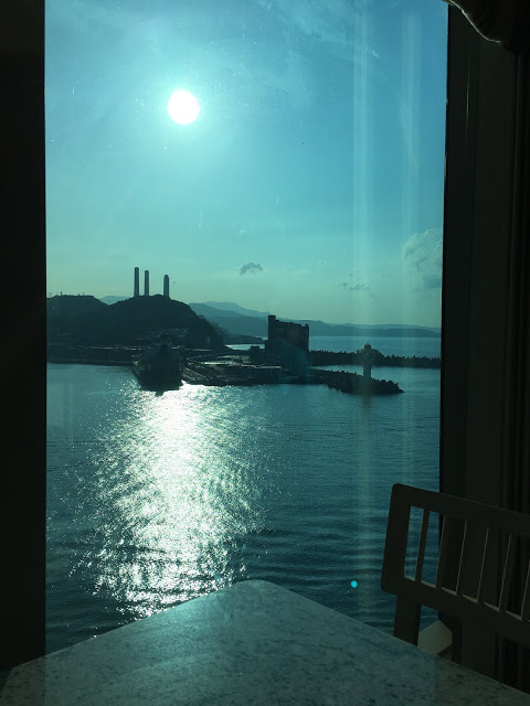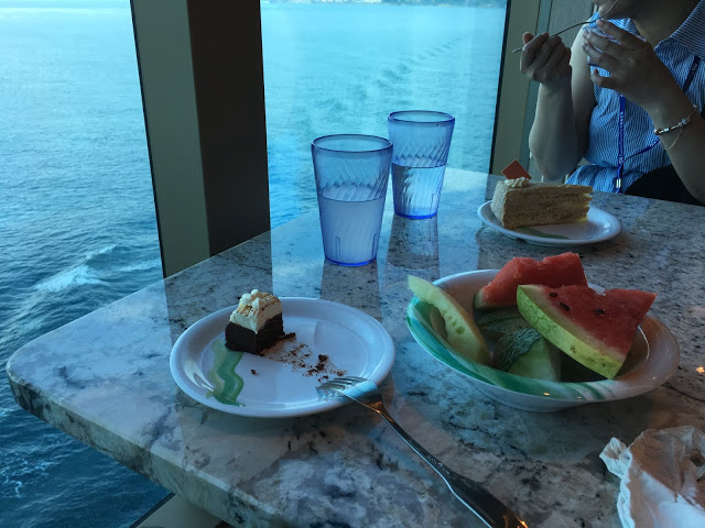 拿了一些蛋糕水果邊看著船駛向大海邊吃著下午茶真是享受阿!!~ 畫面看似很美好,其實太陽很大靠窗熱死了!!哈!~