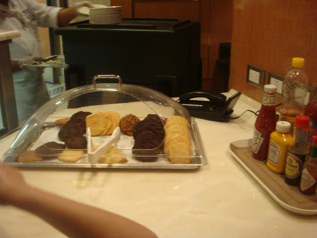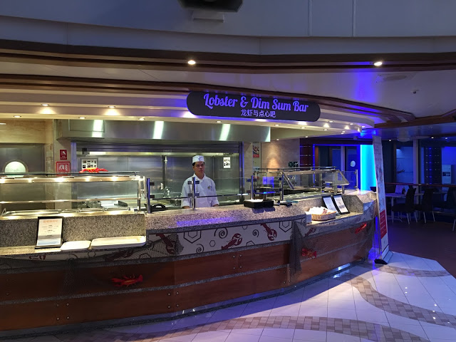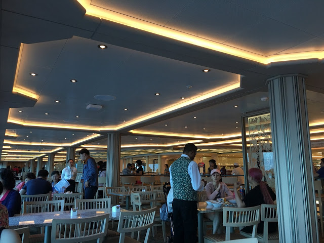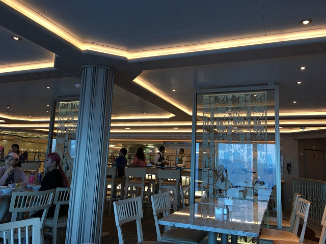 搭電梯來到16樓跟著人群走就可以到達,自助餐廳幾乎全天候開放 早餐,午餐,晚餐都有,五天的航行當中如不想去主題餐廳吃東西,來這邊基本上都有的吃而且一律免費 XD