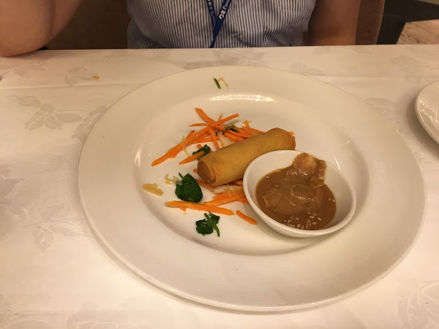菜色:炸春捲包冬粉白菜,沾醬是花生醬