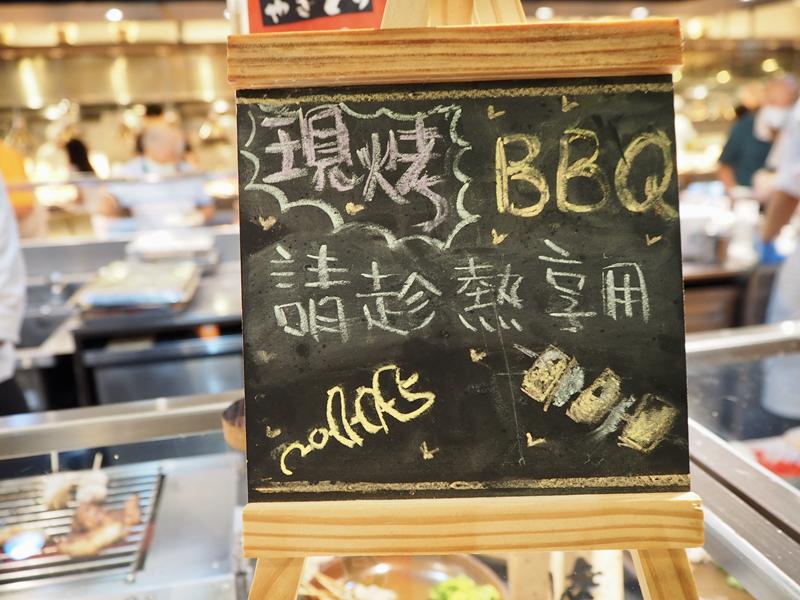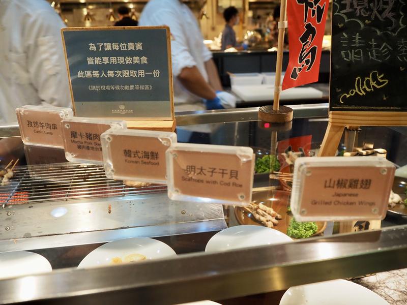 現烤的肉串有五種可以選擇:孜然羊肉串、摩卡豬肉串、韓式海鮮、明太子干貝、山椒雞翅,每次每人限取一份,這時候當然不用客氣….每種來一份!!~ XD