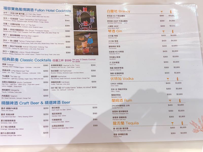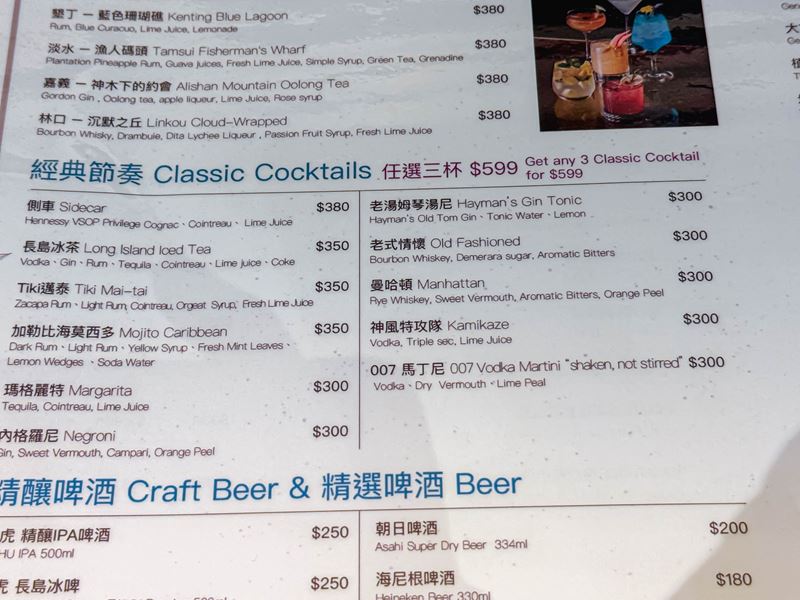 到了晚上有提供調酒,其中經典節奏調酒系NT.599可任選三杯,以往在外面酒吧喝杯調酒約也要NT.350 – 500左右,這個價格真的是滿划算的