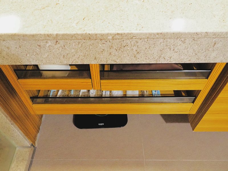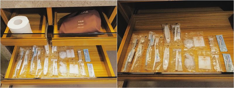 ↑ 備用衛生紙、吹風機、盥洗用品在洗手台的下方抽屜裡,井然有序的四人份用品還滿壯觀的 XD