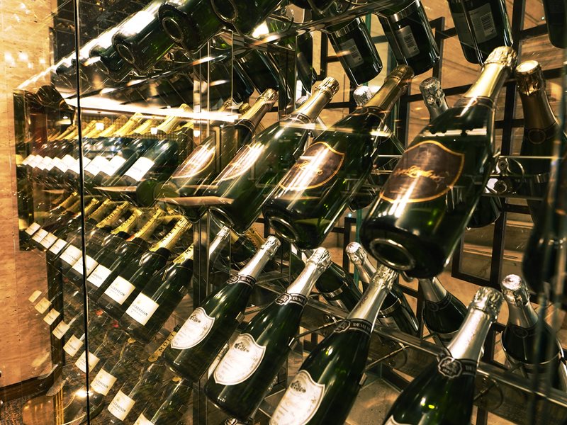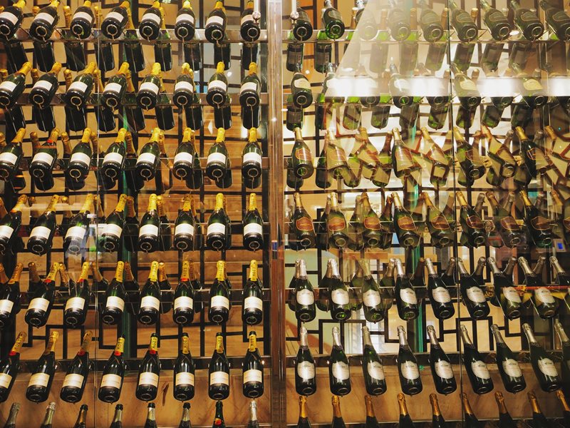 餐廳門口的酒櫃牆,櫃內排排站的酒,滿壯觀的