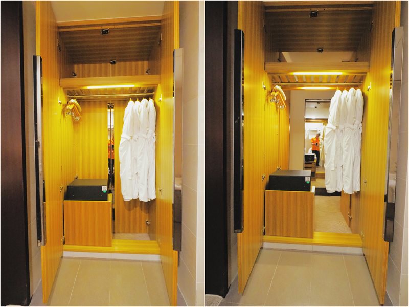 浴室內的衣櫃設計成跟外面衣櫃是互通的,這樣洗完澡就不用還要到外面就可以拿取浴袍,這樣設計還滿方便的