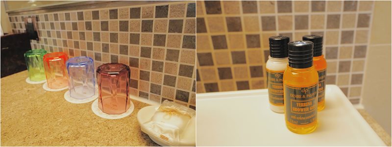 ↑ 洗手台上的漱口杯、沐浴用品(沐浴乳、洗髮精、潤髮乳)是選用Verbena Shampoo品牌的馬鞭草用品組