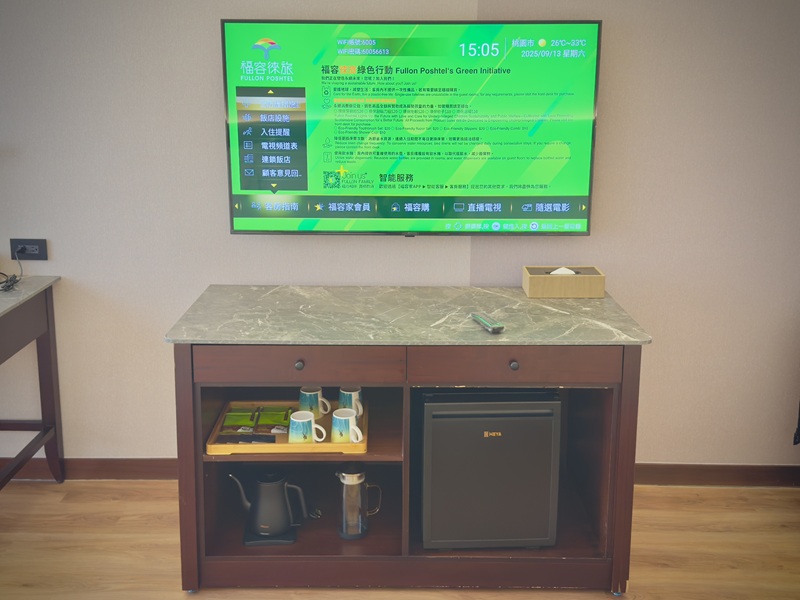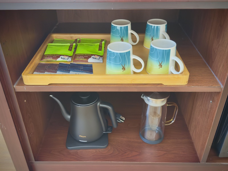 電視櫃下方有飯店精心準備的咖啡、茶包,以及馬克杯等用品,
