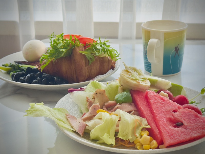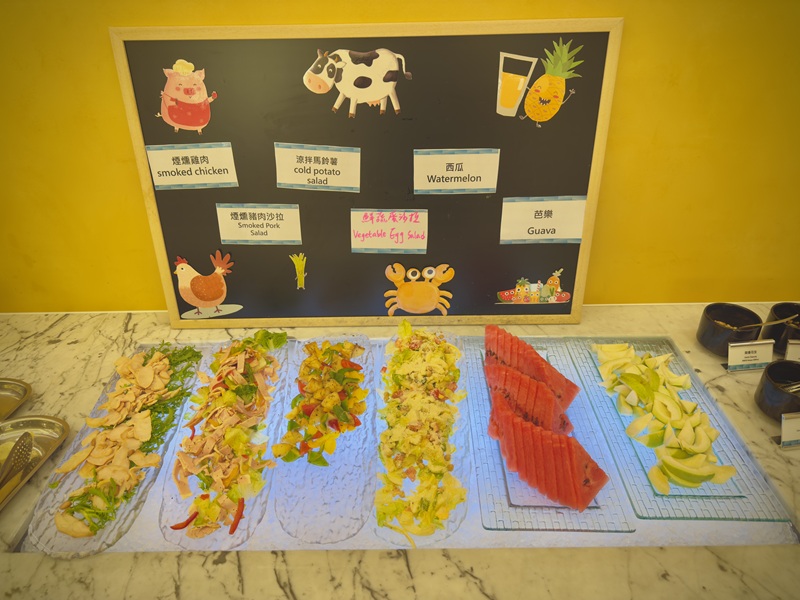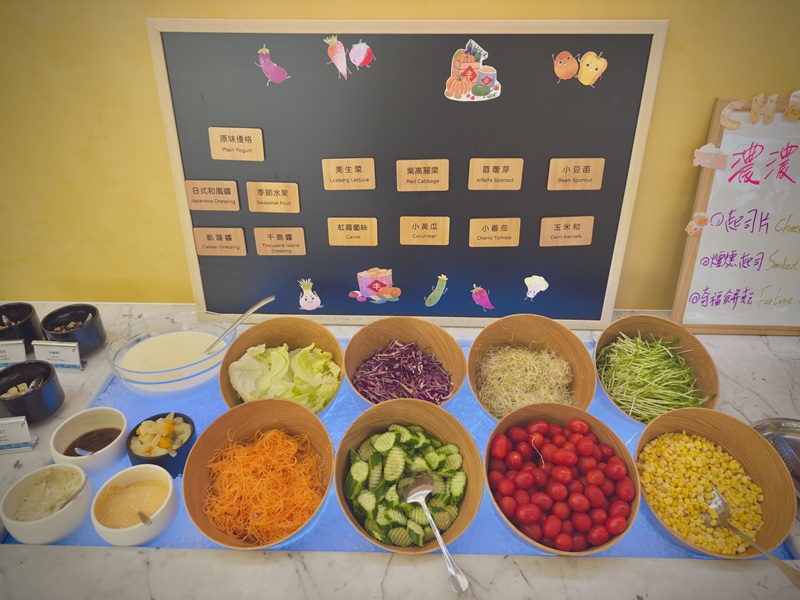有各式熟食、生菜沙拉、新鮮水果、清粥小菜,甚至還有滷肉飯和麵包吐司等多種選擇
