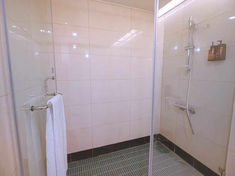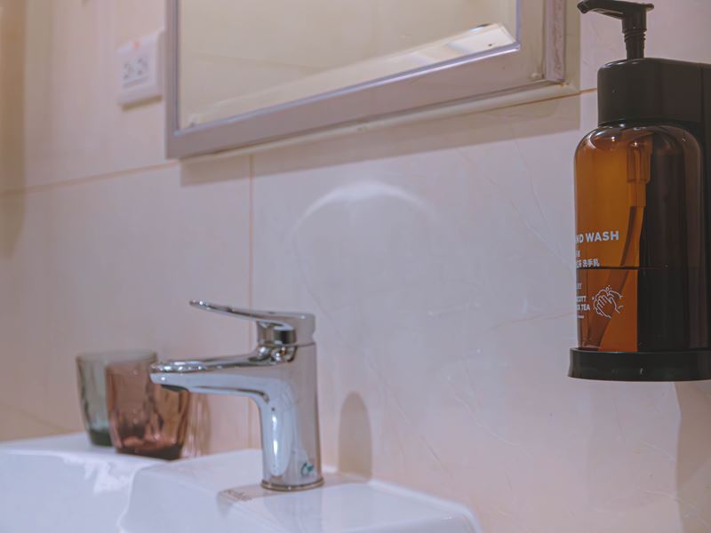 簡簡單單的浴室空間,有做到乾濕分離,洗手台上有準備洗手乳以及漱口杯,但因為是環保旅店的關係,所以並沒有一次性的備品,來到這裡住宿要記得自己攜帶