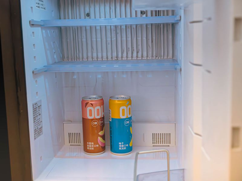 底下的冰箱裏面也有附上兩罐果汁口味的氣泡飲,通常旅電冰箱都是空空如也,這裡有附上飲料已經讓我有些驚訝了 XD