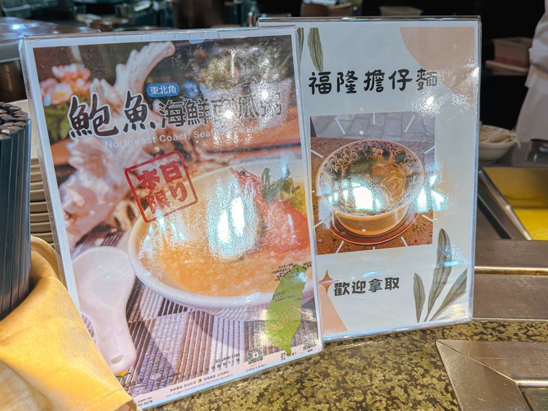 ↑ 現煮的福隆擔仔麵、鮑魚海鮮南瓜粥(東北角限定)