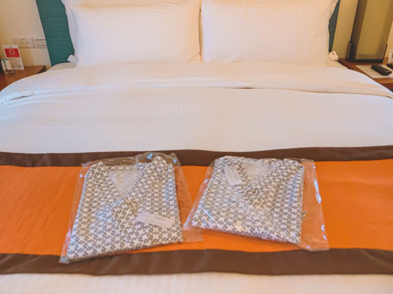 床鋪上有兩件浴衣可以在住宿期間使用