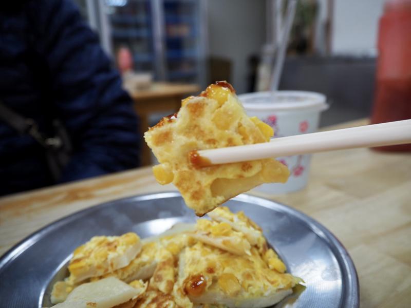 跟印象中的外皮薄薄的蛋餅皮不一樣,但也不會說不好吃,沾上醬油更加像在吃粿,滿有意思的