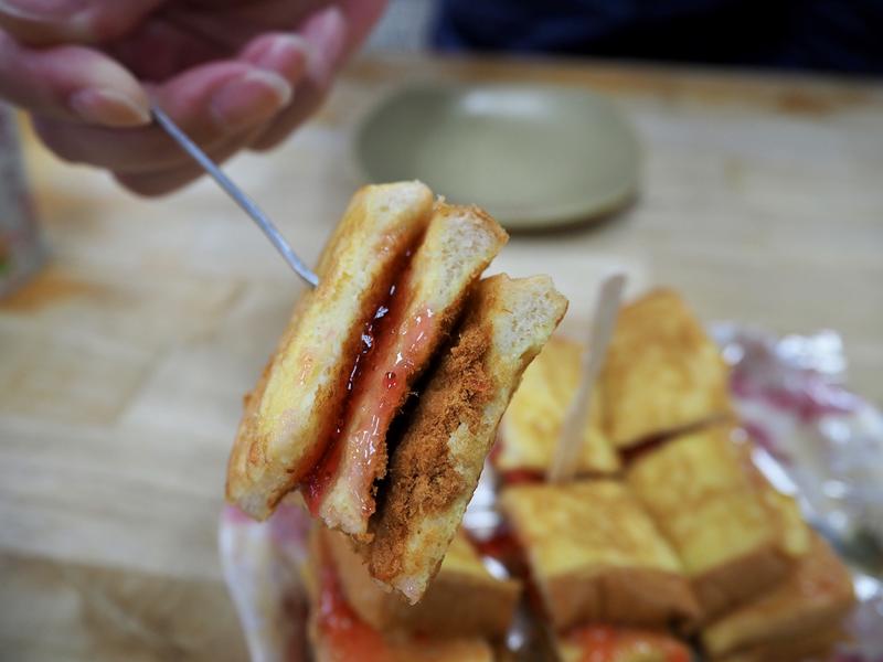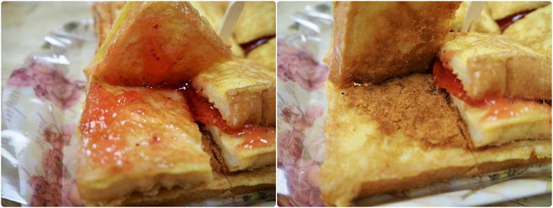 接下來是店家最有名的法國吐司,也是許多人推薦來這裡必點的品項,裹著蛋液下去煎,外皮吃起來口感濕潤,三層高的吐司,一層夾著草莓醬、一層夾著肉鬆,視覺上是有點奇怪但沒想到吃起來意外的搭,鹹甜的口感還滿特別的