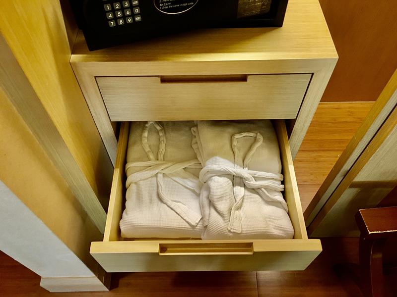 下方有兩層抽屜,上層抽屜有洗衣袋跟用具價目表,下層有兩件浴袍