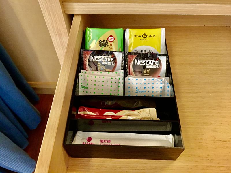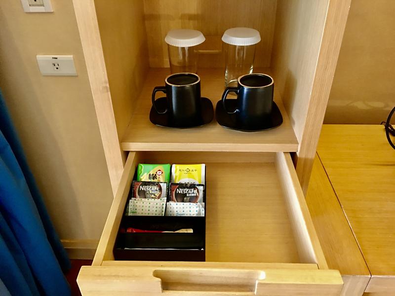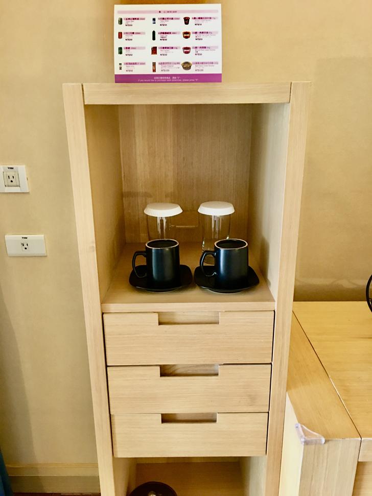 電視櫃旁有馬克杯跟玻璃杯,抽屜內有茶包、奶茶跟咖啡