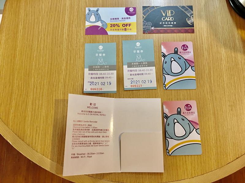 這次入住Check in後取得的東西有房卡2張、早餐卷2張、紀念品兌換卷1張、住客用餐8折卷