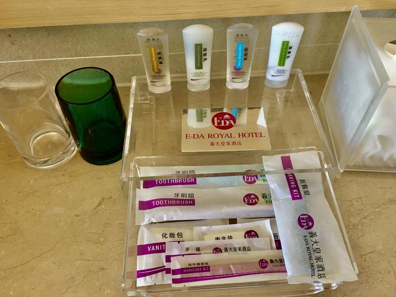 盥洗備品有:洗髮精、潤髮乳、沐浴乳、潤膚乳、牙刷組、刮鬍組、指甲護理組、牙線、化妝包、衛生袋、浴帽、漱口杯等等,幾乎所有用品都幫你備齊了