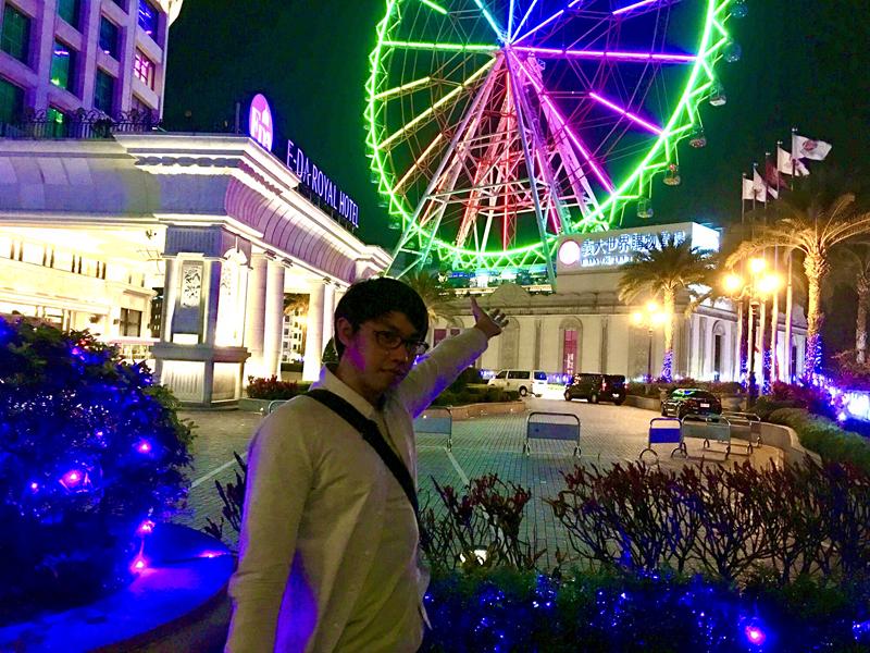 去義大購物廣場逛街後,要回飯店休息時在門口拍的摩天輪,夜晚的摩天輪光彩奪目很美!~